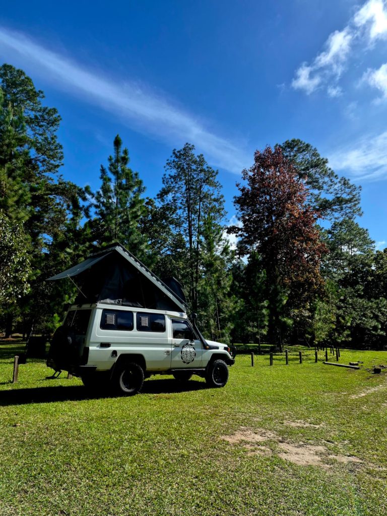 Honduras: Zur Begrüssung gab es erst zwei Stunden Stau an der Grenze und dann eine Pizza, die in die Windschutzscheibe flog. Nicht gerade der beste Start. Doch die ersten Tage neben einem alten Aparthotel waren ganz gemütlich und auch das nächste Ziel in den Bergen – wieder einmal Nadelbäume – war entspannend. Weniger schön war das Fahren, die Spinnen auf der Strasse.