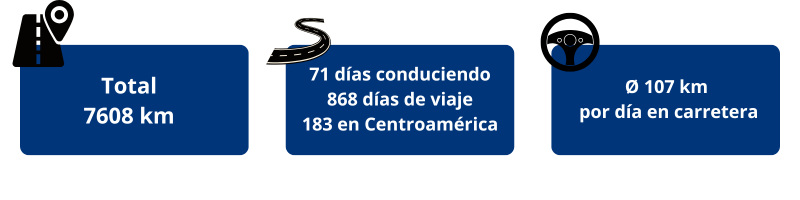 En total, recorrimos 7608 kilómetros en 183 días. Desde Colón, en Panamá, hasta Orange Walk, en Belice. Esto supone una media de 107 kilómetros por día en carretera. Nuestra etapa más larga en un mismo día fue de 306 kilómetros, de Cóbano a Liberia en Costa Rica,para encontrarnos con la sobrina de Miguel.